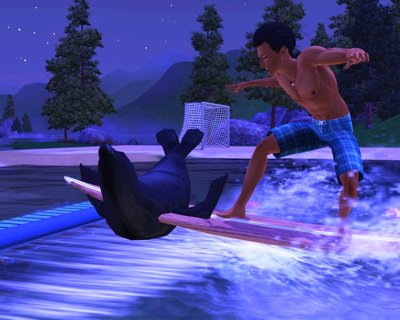 Так в местечковом озере!Оказывается тюлени вообще в бассейнах плавать не должны.Только у меня стор раньше был спираченный.И плавали они где попало.В бассейне,так в бассейне.А теперь лицензионный.Лицензионные тюлени они как выяснилось благородные-с.Встречаются исключительно в озёрах.Ну,или в морях(в море попробуем попозже с Никки покататься,в Хиддене нет возможности поставить участок на воду.Или совсем в море,островом,чего бы не хотелось.Или никак.Пляж у них там *Луговой*.Причём омечен был как *место для рыбалки*.Но ни пруда,ни даже лужи захудалой на участке не было.