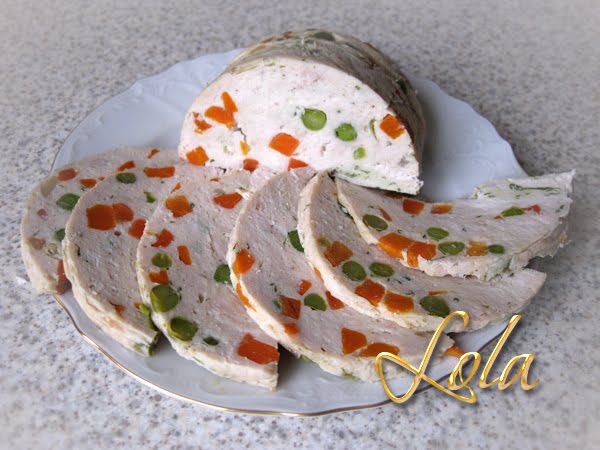 Филе куриное измельчаем в блендере, добавляем специи, соль. Смешиваем с морковно - гороховой смесью. В ветчинницу прокладываем фольгу. Смесь хорошо утрамбовываем, закрываем ветчинницу и кладём в кипящую воду. В обычной кастрюльке варим 1,5 часа, в скороварке - 35-40 минут. Остужаем и вкуснятина готова