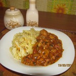 Ингредиенты: Фарш куриный, Ветчина, Морковь, Лук репчатый, Томатная паста, Перец черный, Соль, Лавровый лист, Мука, Масло подсолнечное, Вода. Тэги: обед, второе.
