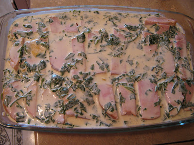 Подготовить соус для запекания, смешав сметану, сливки, яйцо, вино и мускатный орех. Заправить солью и молотым черным перцем по вкусу. Заливаем все соусом, накрываем фольгой и ставим в духовку предварительно разогретую до 180 гр. минут на 25-30, за 5-10 минут фольгу снимаем для образования поджаренной корочки.