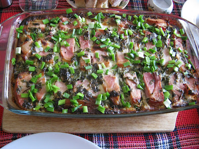 8 шт среднего картофеля, предварительно отваренного в мундире 300 гр квашеной капусты 300 гр бекона или окорока, грудинки, сыровяленой ветчины и т.д.) 100 гр сала для шкварок 1 луковица 1 маленький жгучий перчик по желанию 1 ст л оливкового масла 70 -100 мл белого вина (можно обойтись) сливочное масло для смазывания формы 100 гр. сметаны 100 г сливок или молока 1 яйцо немного тертого мускатного ореха свежемолотый черный перец соль зеленый лук для подачи